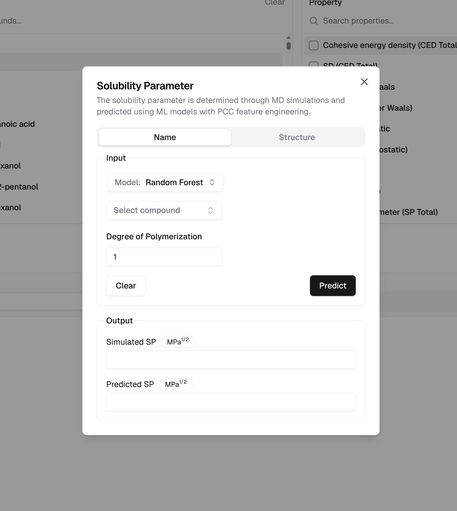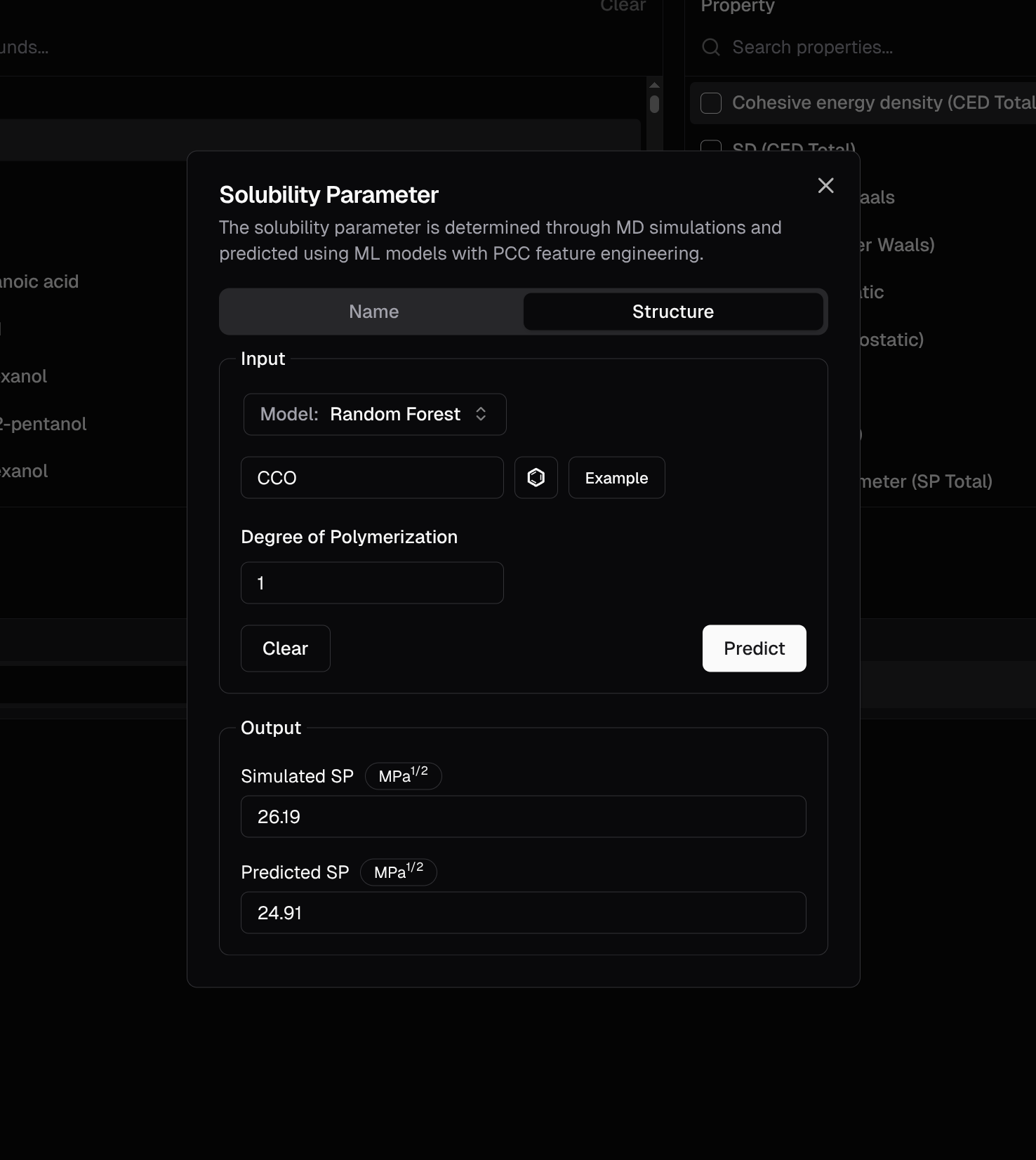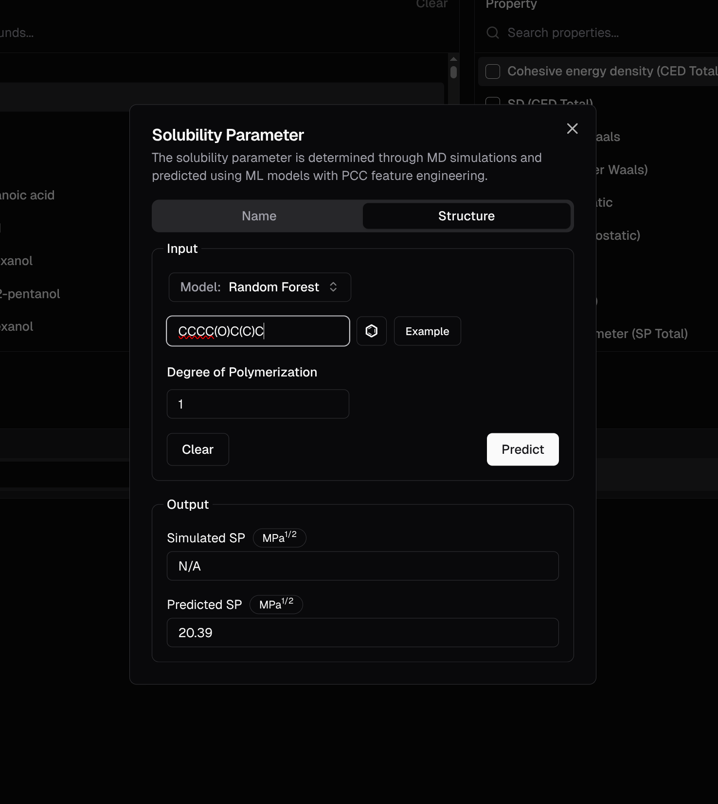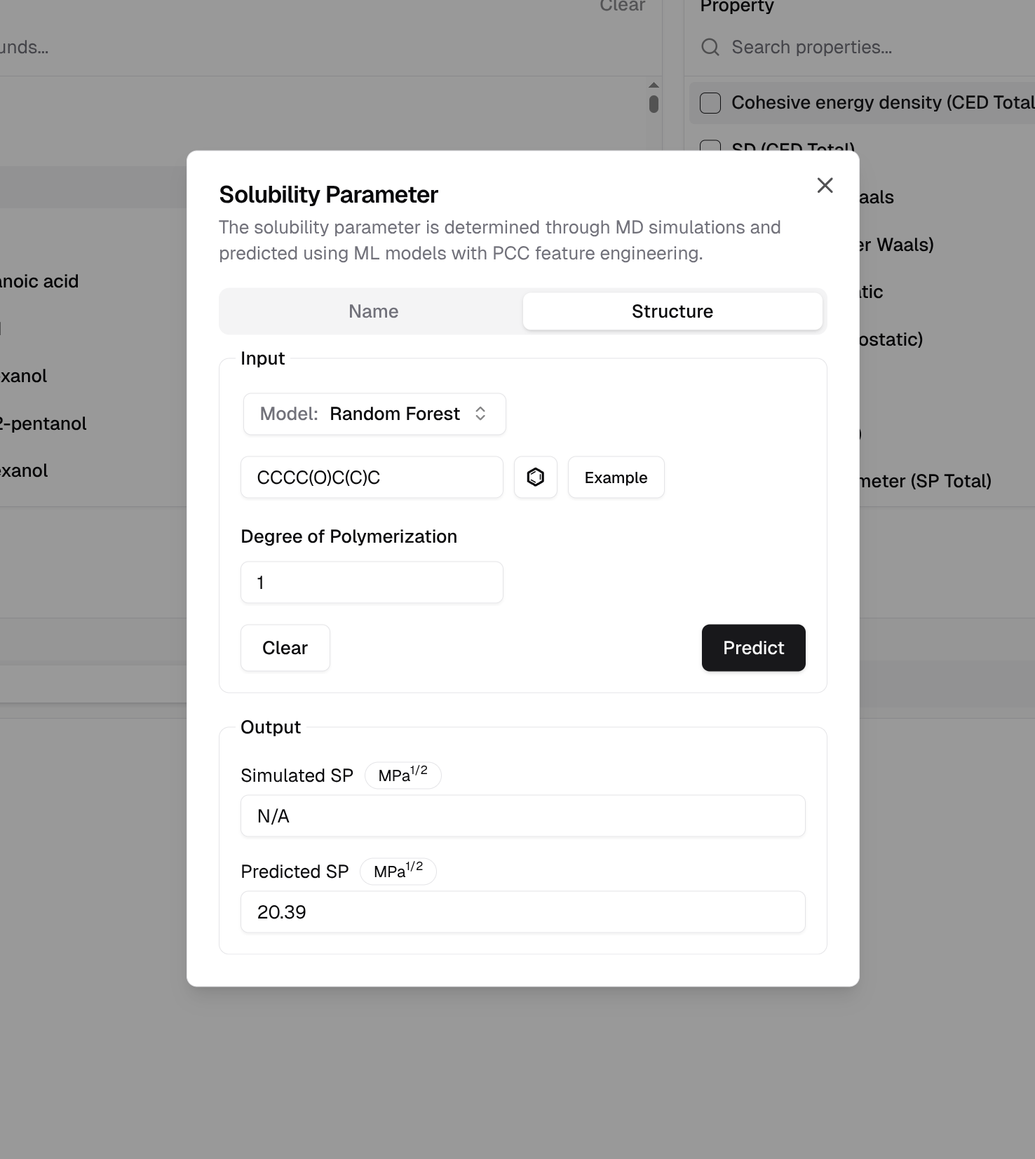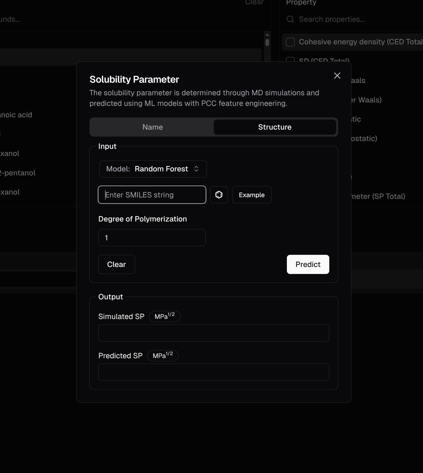Currently, only an in-house model (developed by the Computational Materials Science Group) is available for predicting the solubility parameter.