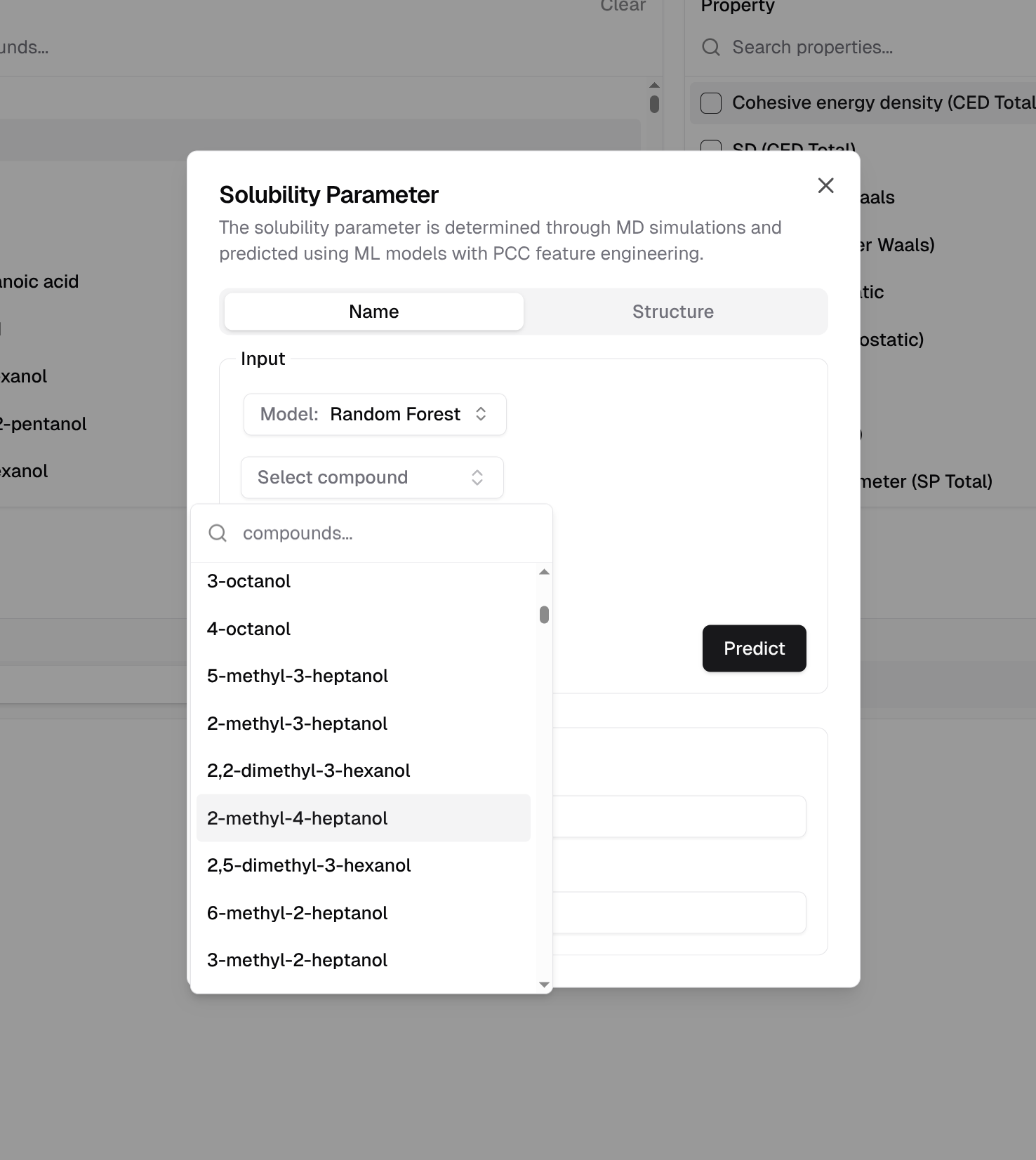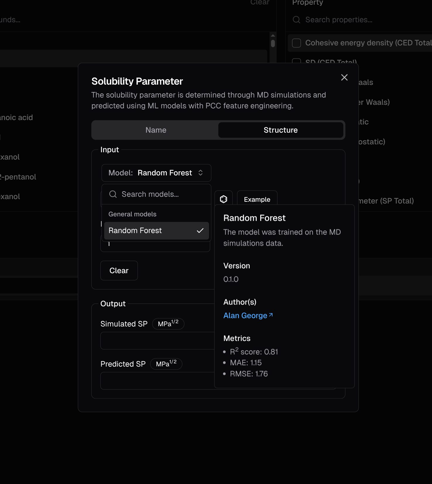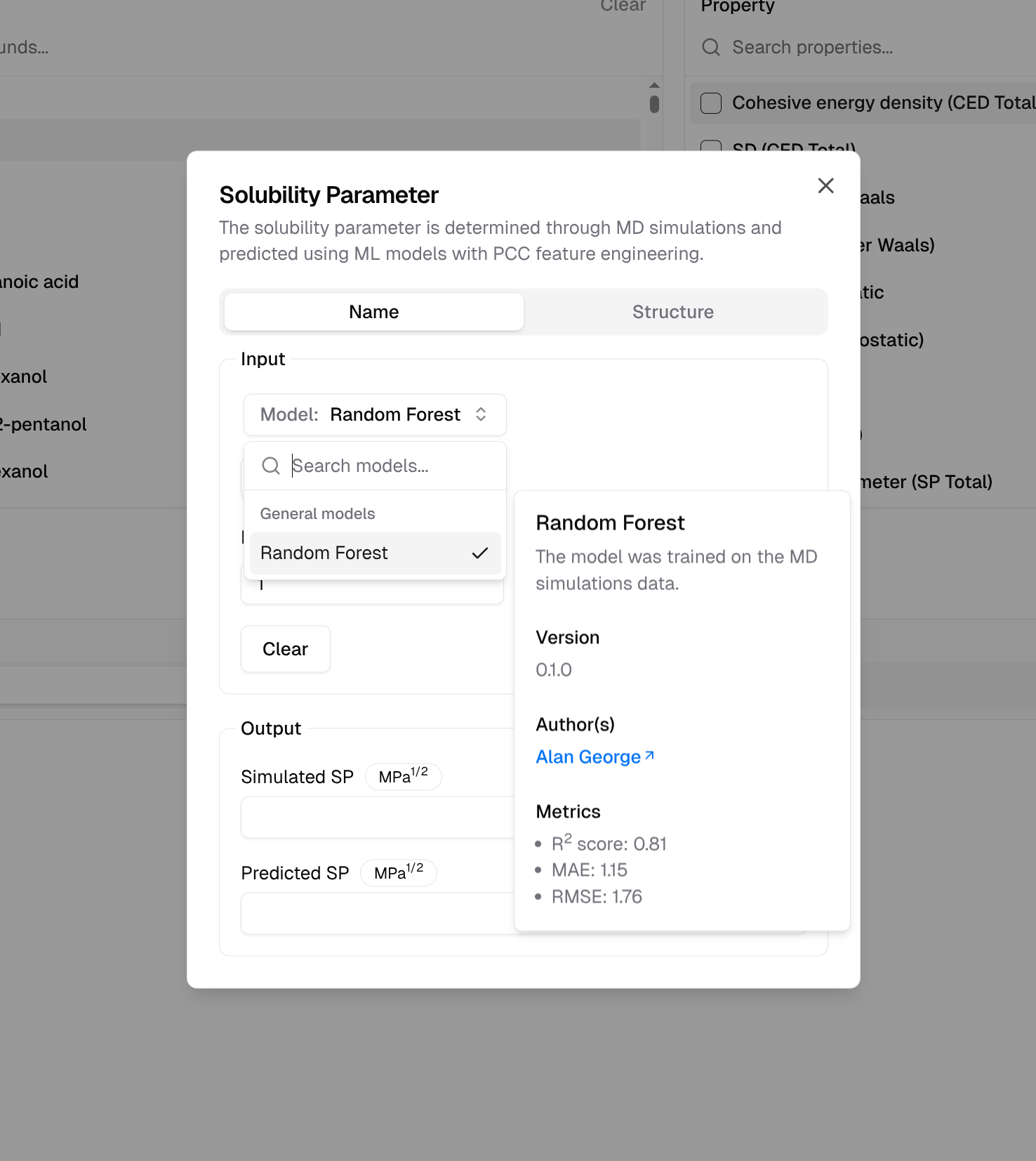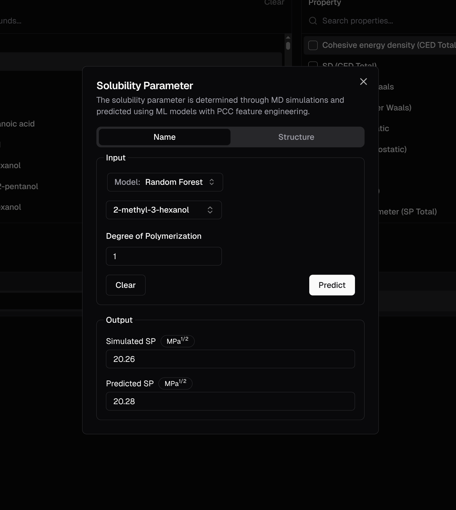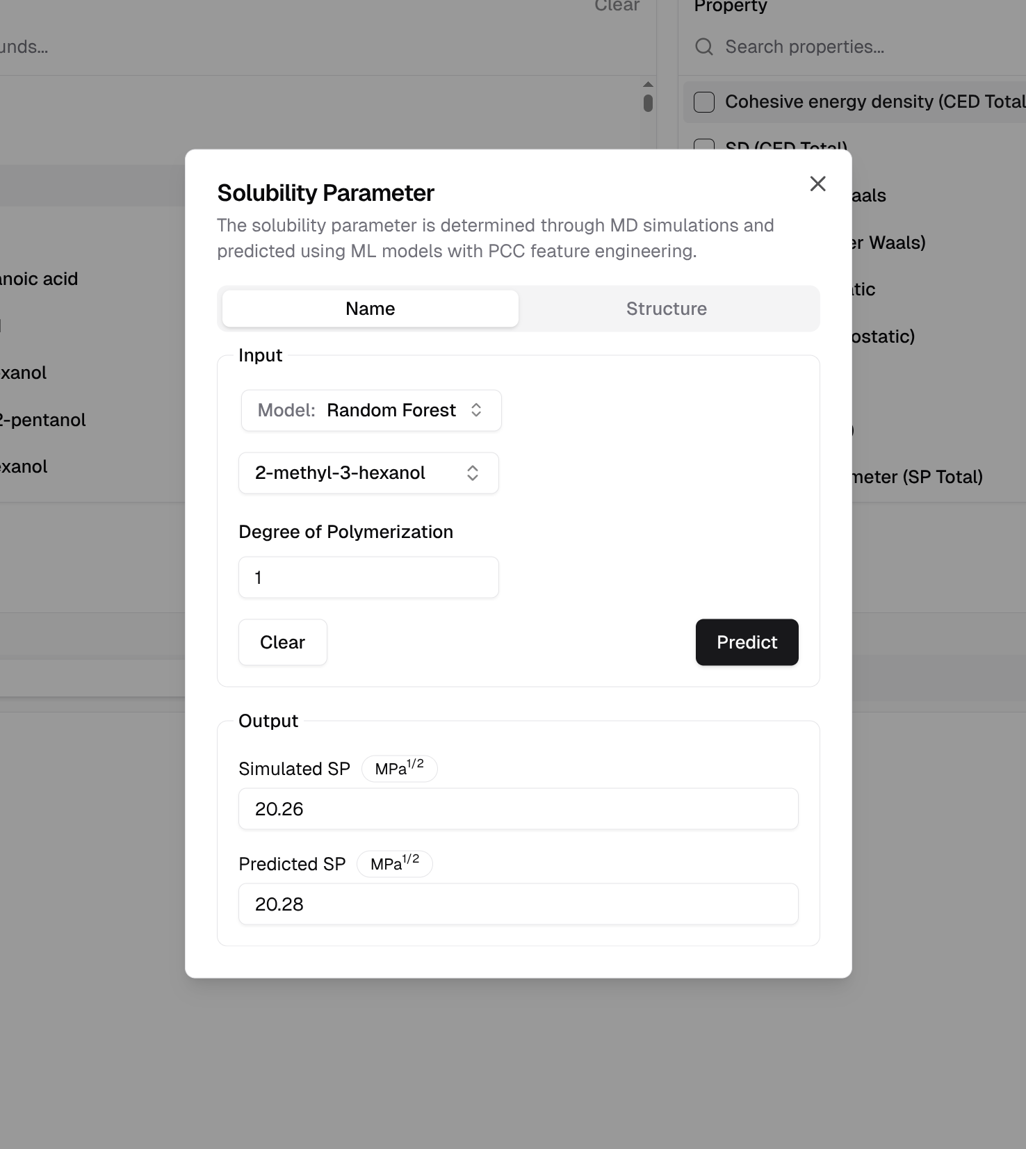 Currently, only an in-house model (developed by the Computational Materials Science Group) is available for predicting the solubility parameter.